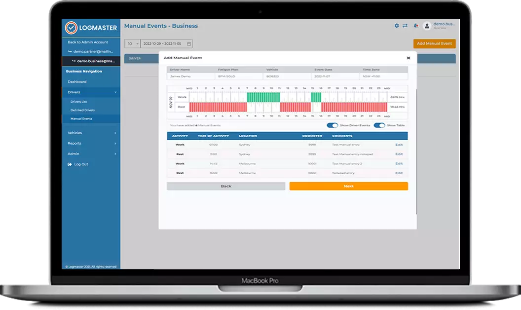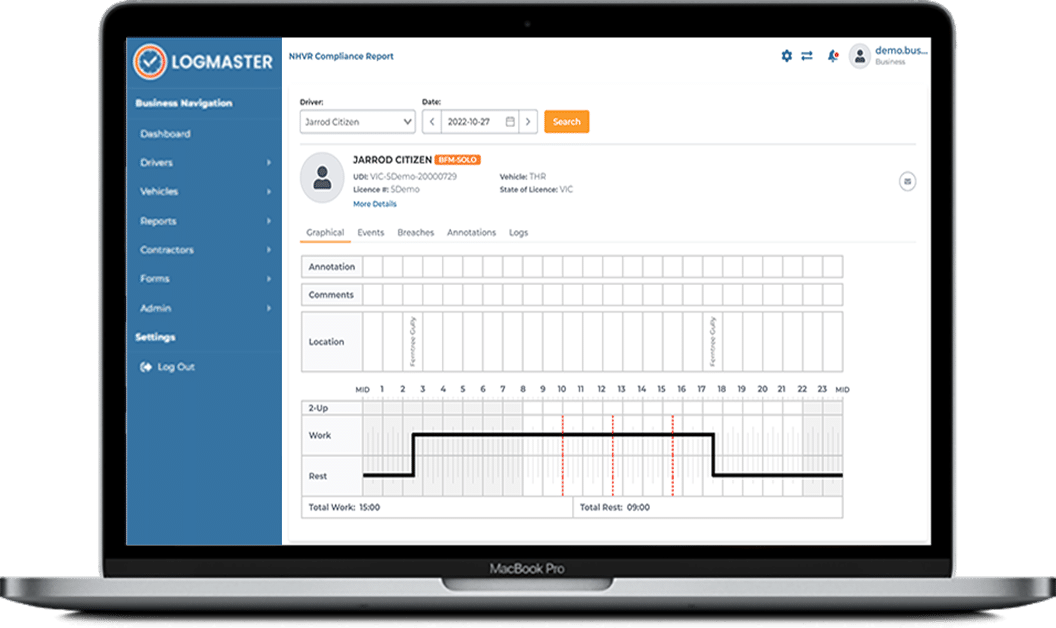 Instead of drivers needing to remember work and rest times, when they need to pull up for a break and how long their break needs to be, Logmaster provides the information right there in their smart phone or tablet. Drivers simply log in and they can see how long they can drive before they need to have a rest.