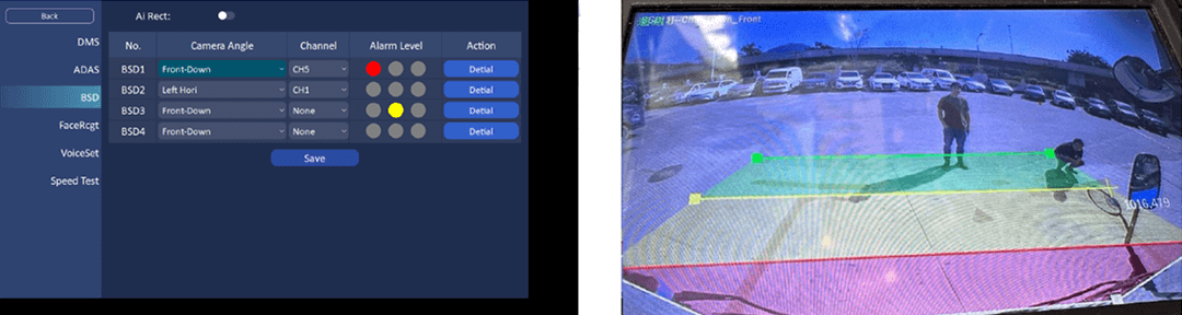 Front and rear BSD cameras continuously monitor for pedestrians and trigger clear, immediate alerts to help operators react sooner. Detection supports people moving around the machine as well as those entering higher-risk areas inside warehouses and on outdoor worksites, helping reduce near-misses and improve overall site safety.*