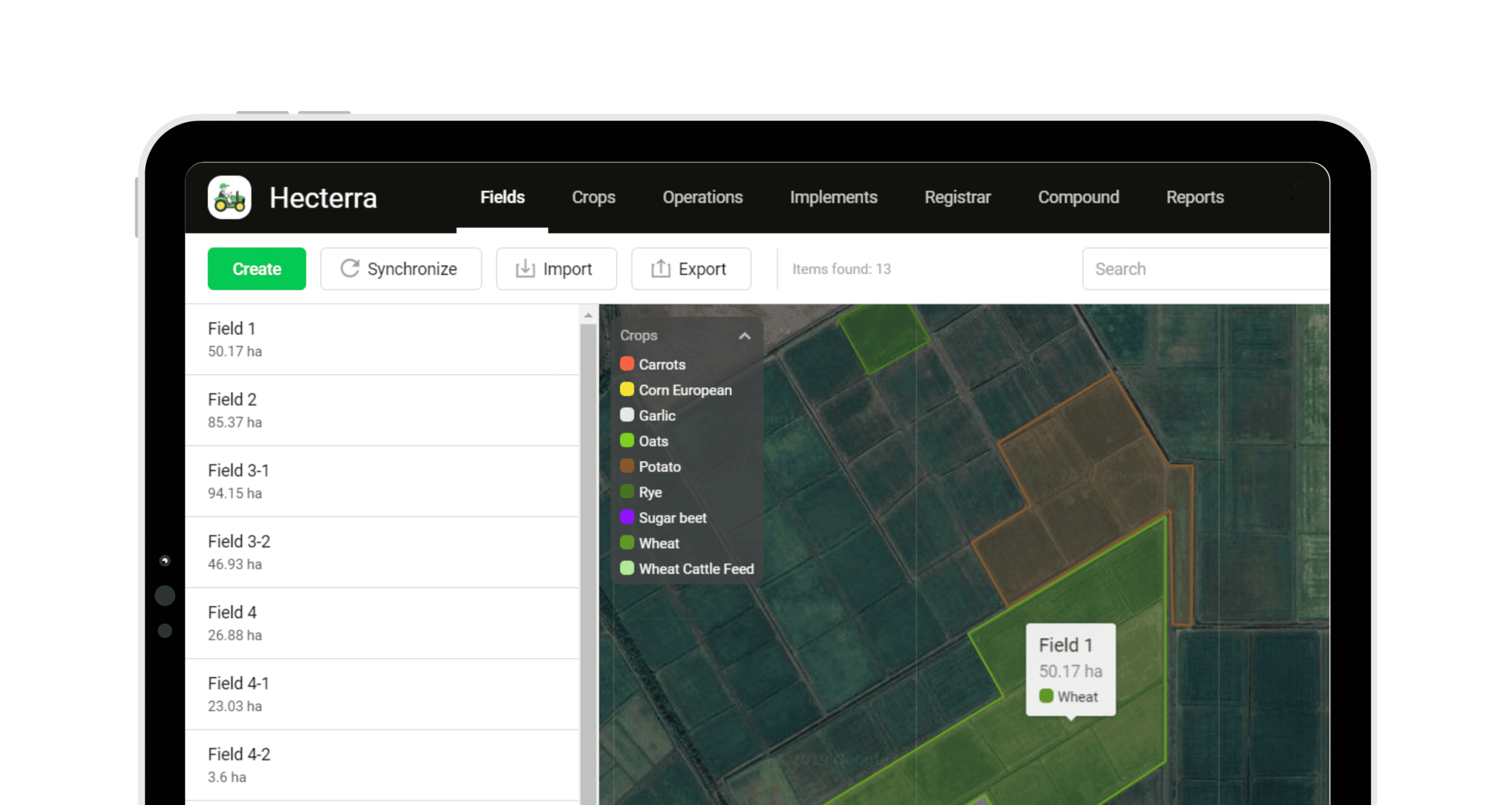 Our integrated agri-business application enables farmers to map individual fields using geofences and create a catalogue of crops and crop rotations. You can also create field cultivation schedules and review cultivation statistics such as duration and area.